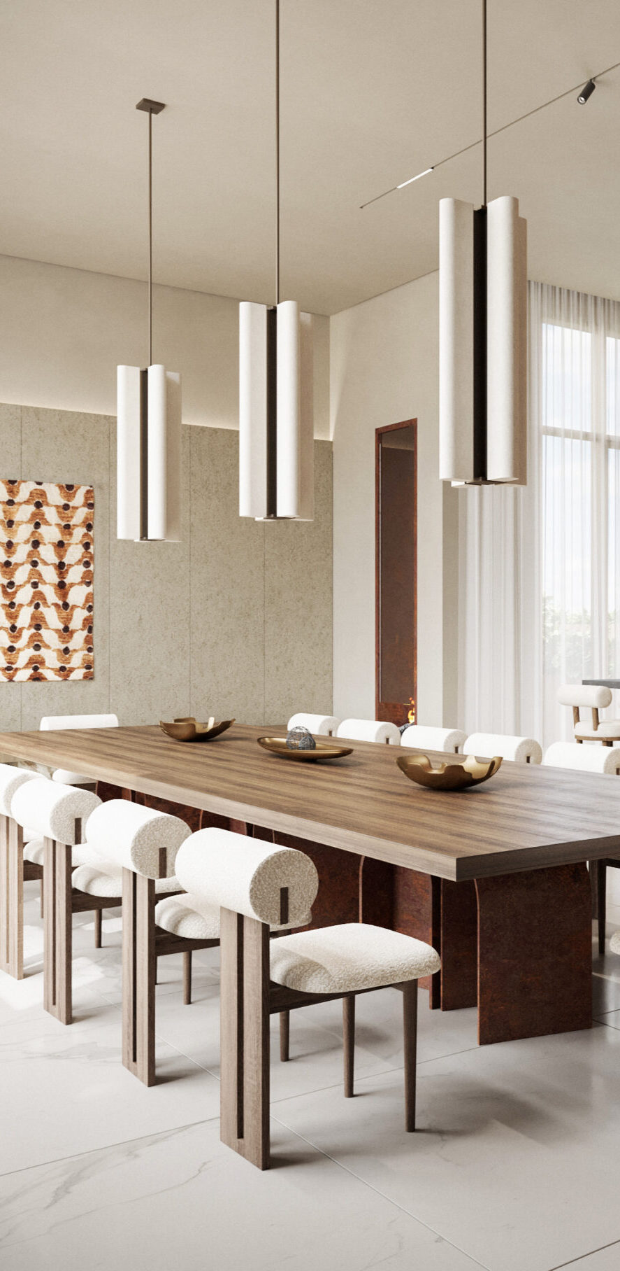 This project presents a refined dialogue between materiality and spatial composition. The foundation is set by cream stone flooring, whose serene surface is punctuated by the rugged elegance of Corten steel accents. These elements define the material palette, guiding the selection of furniture and finishes.
